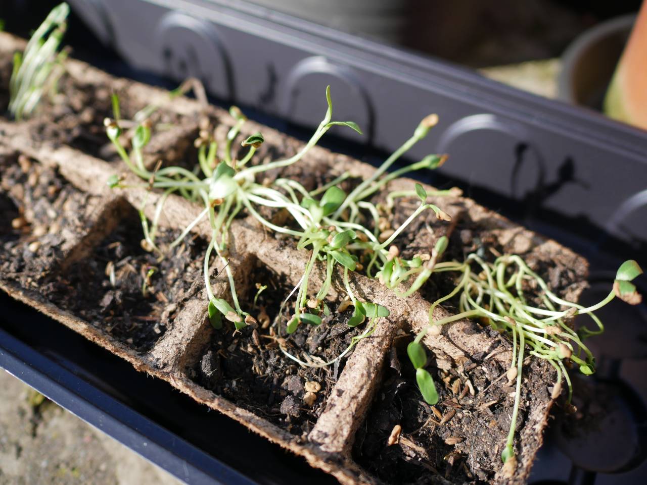 Für die, die wollen: Die Anzuchtschälchen mit Erde befüllen und gut mit Wasser tränken. Dann eine Handvoll (5 – 10, keine buchstäbliche Handvoll) pro Sektor verteilen und leicht andrücken. Die Ausbeute ist doch unter Umständen recht hoch, aber man kann die Pflanzen auch gut verschenken.