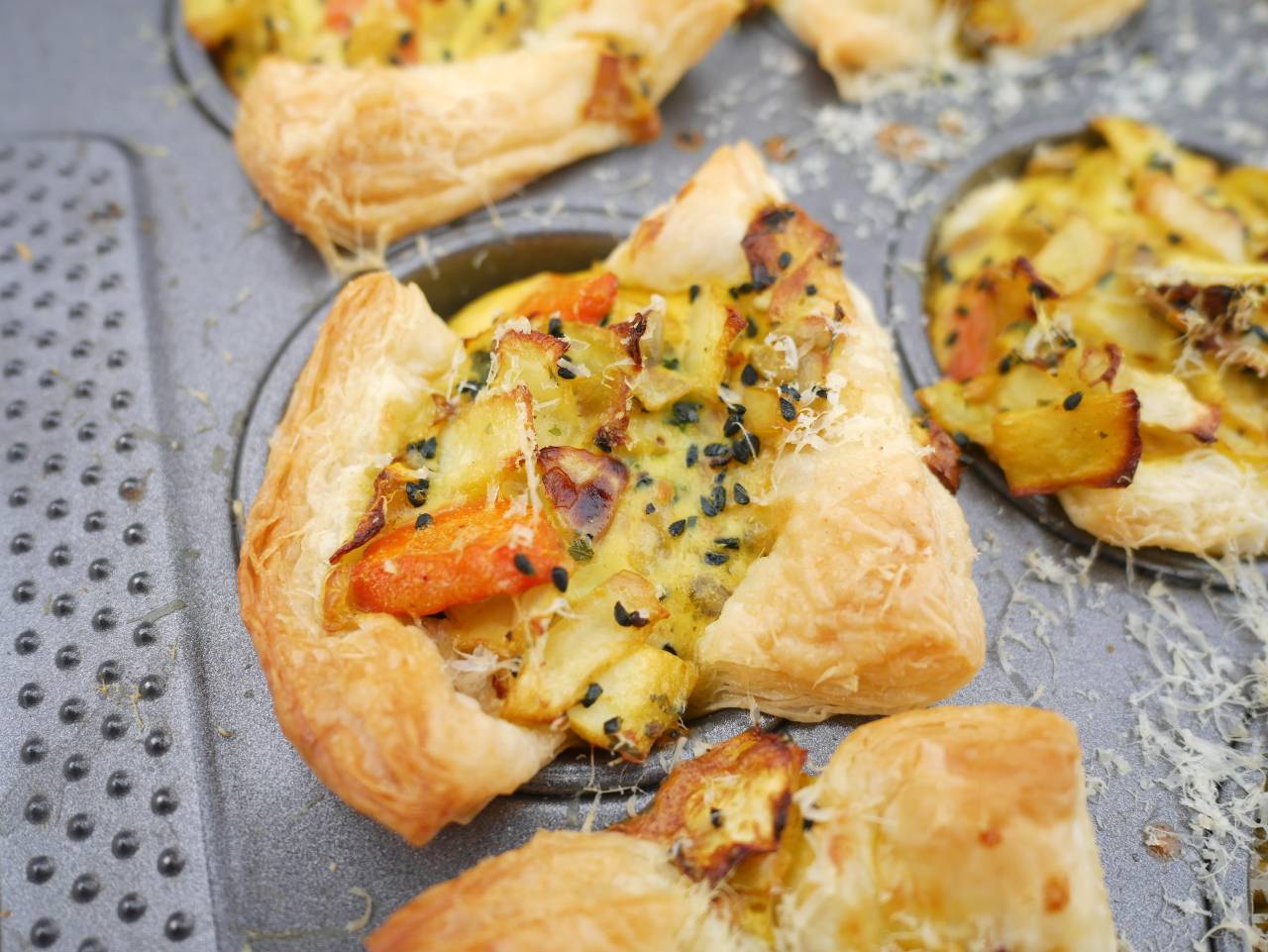 1. Ofen vorheizen auf 200 Grad C Umluft. Pfanne können wir auch schon mal anmachen auf mittlere-hohe Temperatur. In der Zeit Kohl, Zwiebel und Möhrchen in 1–2 cm dicke Quadrate schneiden. Dann in die heiße Pfanne und abraten. Den Blätterteig in 12 (oder wie viel man machen möchte) gleich große Rechtecke schneiden, die Muffin Form mit Olivenöl einstreichen und die Blätterteig-Rechtecke hineinstecken. Vorsichtig andrücken und mit der Gabel den Boden einstechen. Wenn der Ofen heiß ist, rein damit. Sie sollen nur ein paar wenige Minuten vorbacken, dass der Boden hält und ein bisschen knusprig wird.